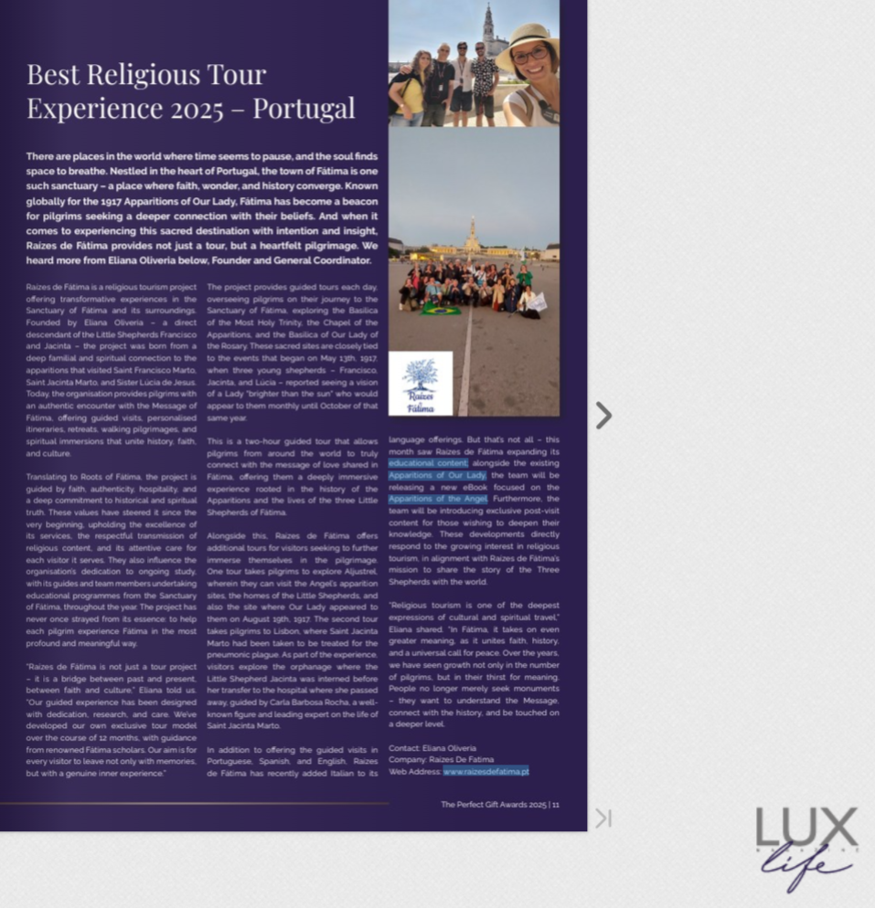 Uma oportunidade única para conhecer melhor os espaços sagrados, a história das Aparições e os sinais deixados pela presença de Nossa Senhora em Fátima com a equipa do Raízes de Fátima, numa visita que acaba de receber mais um prémio, “The Perfect Gift Awards 2025” da Lux Life (Reino Unido).